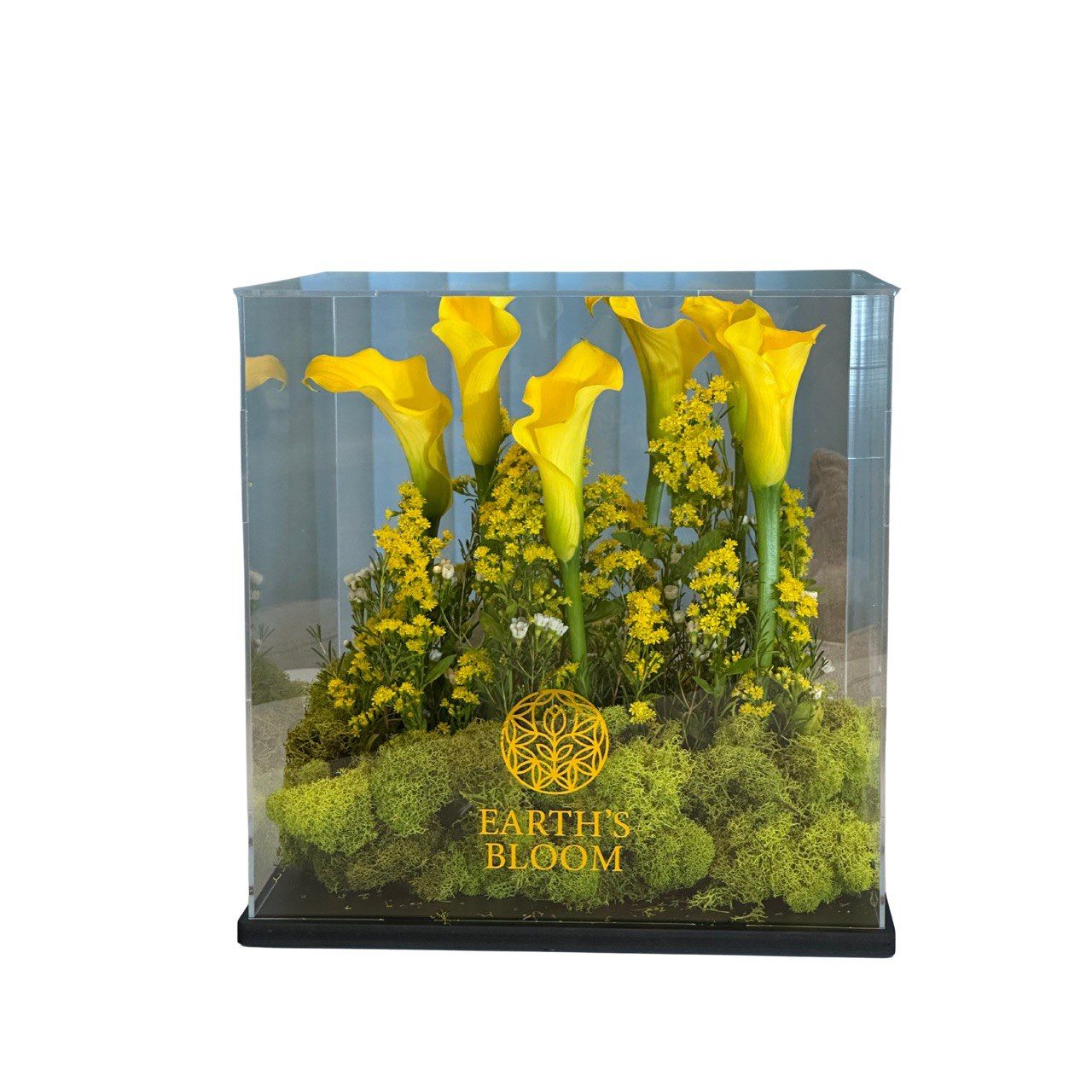 A luminous arrangement featuring premium yellow calla lilies surrounded by delicate golden florals and lush natural moss, artfully designed inside a crystal-clear acrylic box.